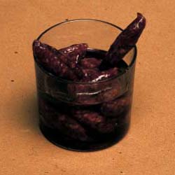 La salsiccia di cinghiale sott’olio ha intenso colore rosso bruno,