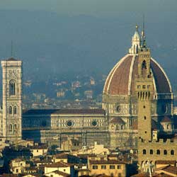 As you get closer to the end you see that there are many people in the piazza ahead. Must be something important. And when you reach the end and come into the Piazza del Duomo and see that magnificent facade with ts tricolor marble. You are overwhelmed by the scale of the church, its huge dome rising out of the ground like a huge orange flower. You stop and look up and around and you cannot stop your eyes and you almost feel dizzy as you look up at the bell tower.